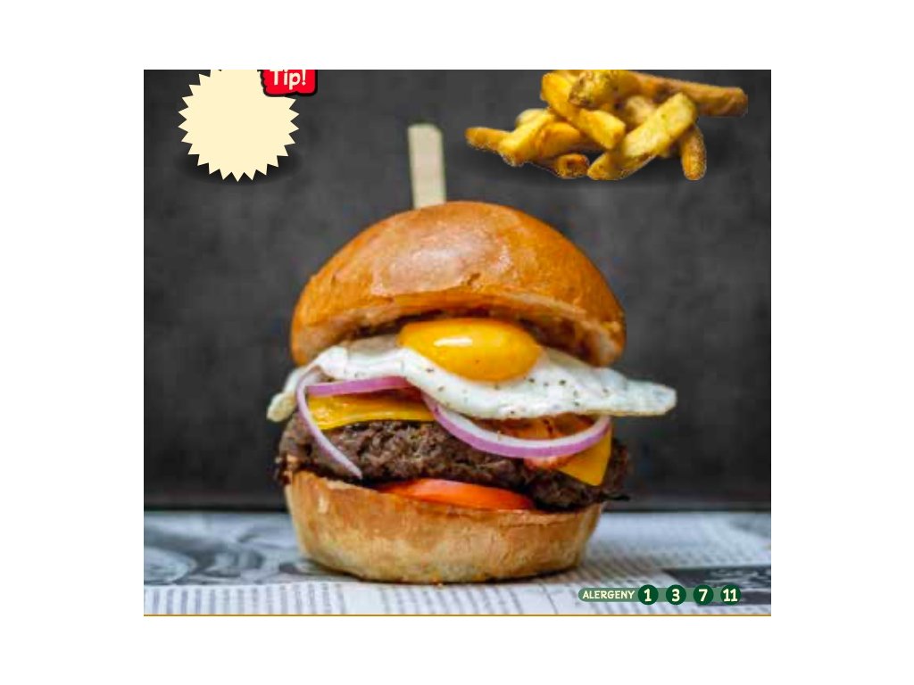 CONCERTINO BURGER - 180g hovězí maso, slanina, BBQ omáčka, gouda, rajče, cibule, sázené vejce, bramborové hranolky